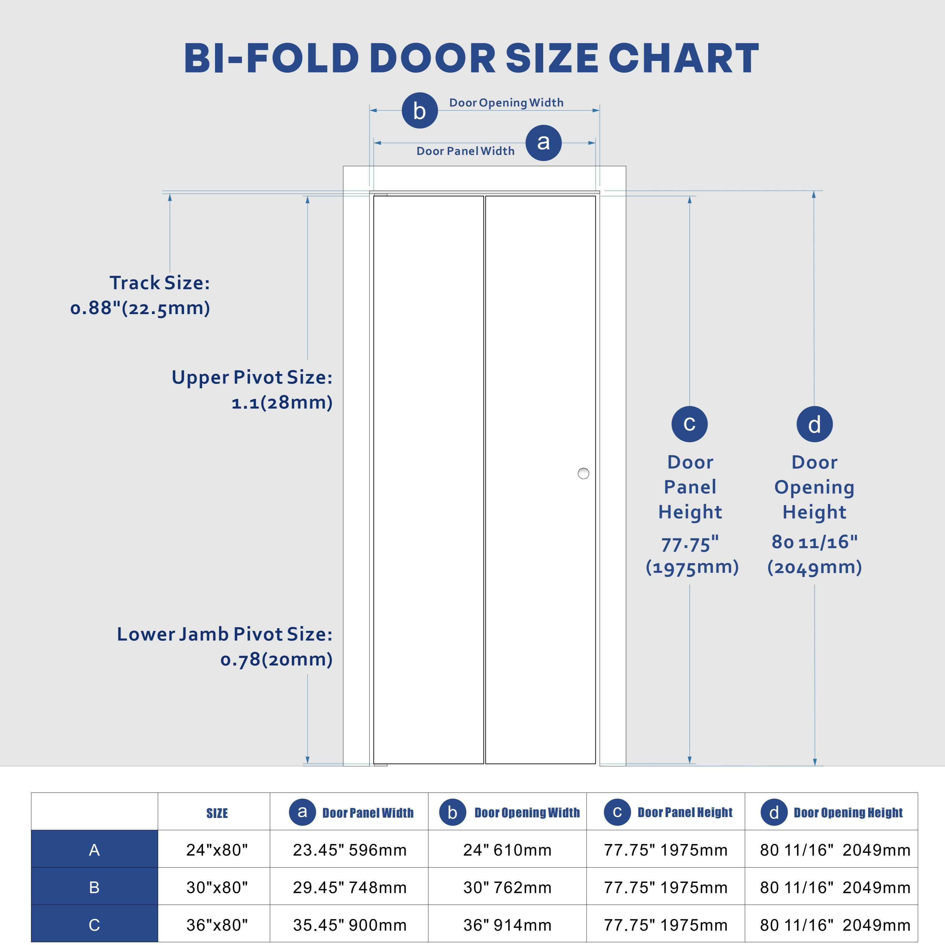 Bifold doors feature a modular design and an easy-to-install track system, making installation quick and hassle-free. The panels are connected with hinges for simple assembly, and the track system guides the doors along the top track, eliminating the need for precise adjustments. Available in standard sizes like 24" x 80", 30" x 80", and 36" x 80", bifold doors are a great solution for interior doors, offering flexibility to fit a variety of openings , whether for small spaces or larger openings.
