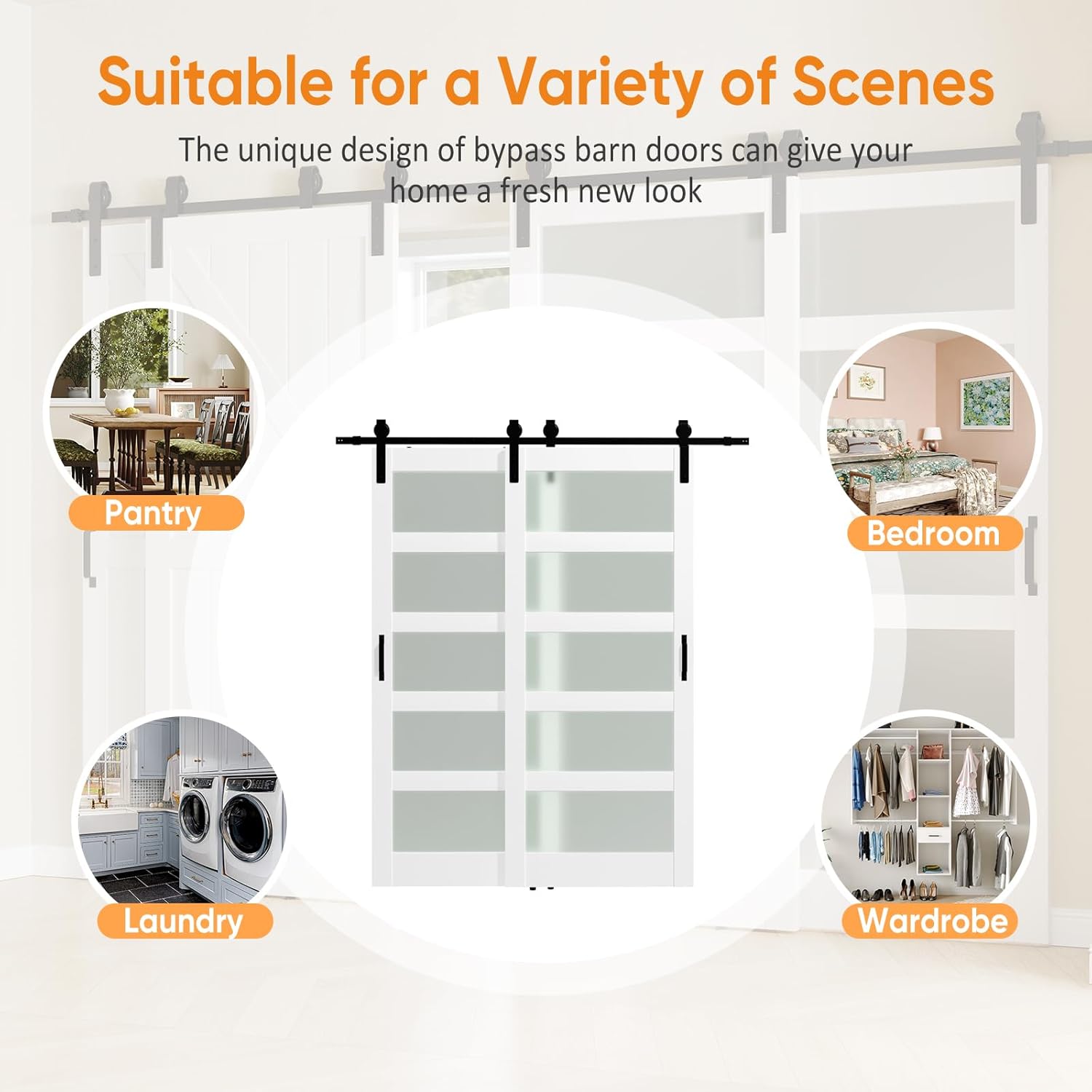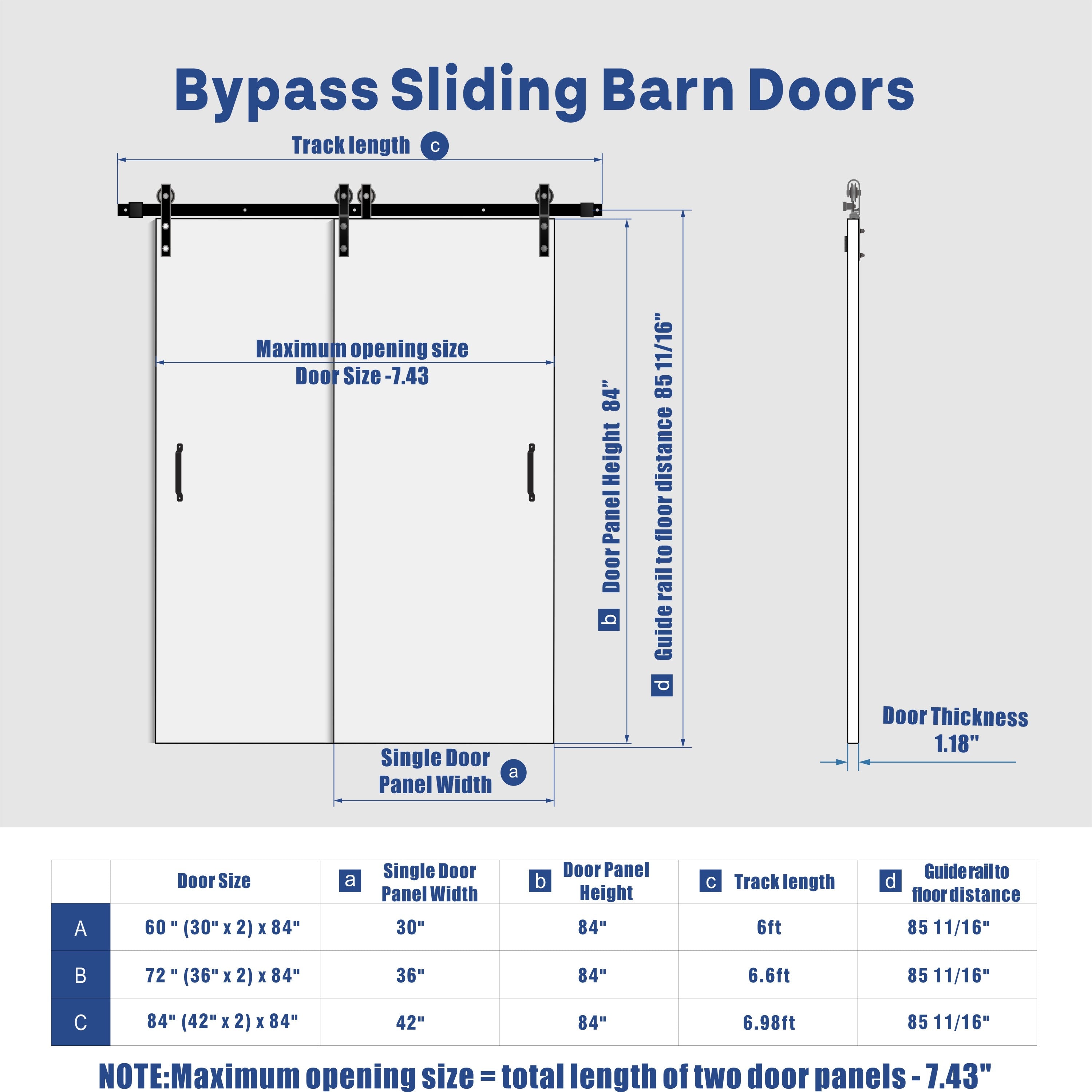 Bypass barn doors are easy to install, with flexible placement options, a convenient installation process, and simple adjustments.The bypass barn door features a distinctive design with overlapping panels, enabling a wider opening in compact spaces, available in a variety of sizes, including 30" x 84", 36" x 84", 60" x 84", 72" x 84",making them practical interior doors.