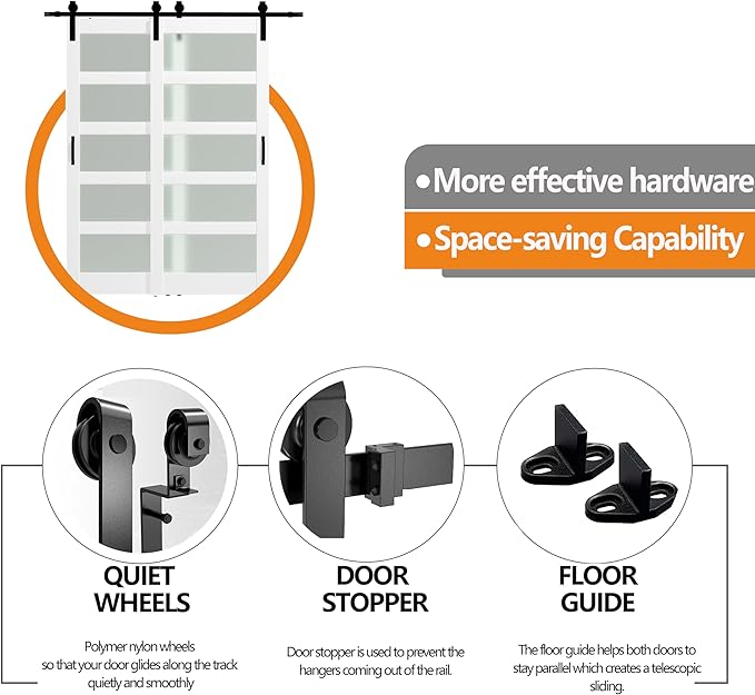 The high-quality and effective hardware comes fully equipped, including quiet wheels, a door stopper, and a floor guide, guarantees safe and smooth operation, and satisfies space-saving needs.